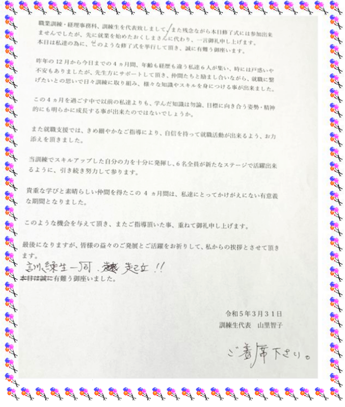 令和4年度12月生 県委託訓練 経理事務科 修了式