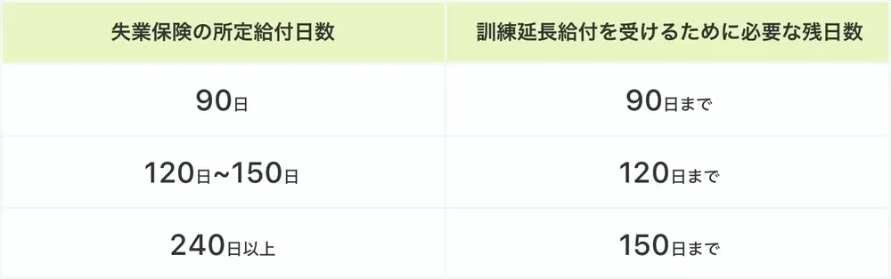 ただし、失業保険の残日数によっては訓練延長給付を受けることができない場合があります。ご自身が訓練延長給付を受けることができるかどうかは以下の表を参考にしてください。